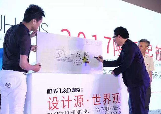 唯美L&D陶瓷作為本次活動的獨家承辦方,也在這次大咖云集的盛會上大放異彩,隆重發布了2017年“包豪斯·新工業風”新品。由梁志天先生、孟也先生、唯美L&D陶瓷事業部副總經理喻紅華先生、北京遠東神華集團副總裁孫凱先生、北京遠東神華集團副總裁武占峰先生共同完成了新品揭幕儀式。揭幕儀式后,梁志天先生、孟也先生紛紛在“包豪斯·新工業風”產品上簽名留念,現場千位設計師朋友們共同見證了這一時刻。