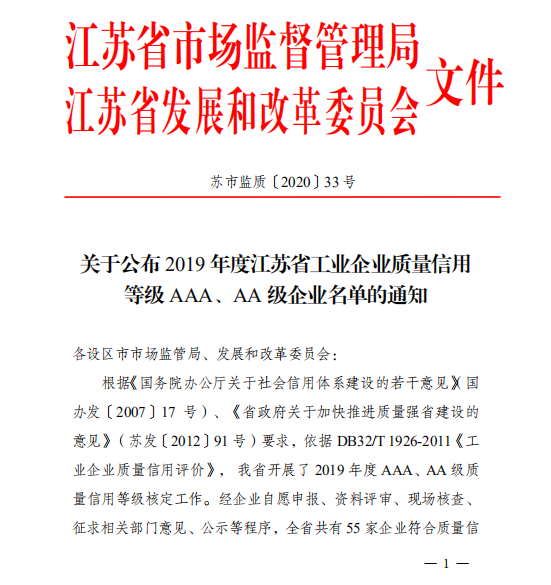 我司榮獲2019年度工業企業質量信用等級AAA級企業榮譽